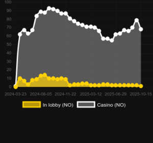 Based on the charts above, the game’s average position in casino lobbies across tracked regions (e.g., Norway data) fluctuated between positions 145 – 151 from March 2024 to October 2025. Meanwhile, its SlotRank NO improved dramatically from ~22 000 to the top 500 shortly after release, indicating better visibility and player engagement. This trend often mirrors increased retention among real-money slot audiences.